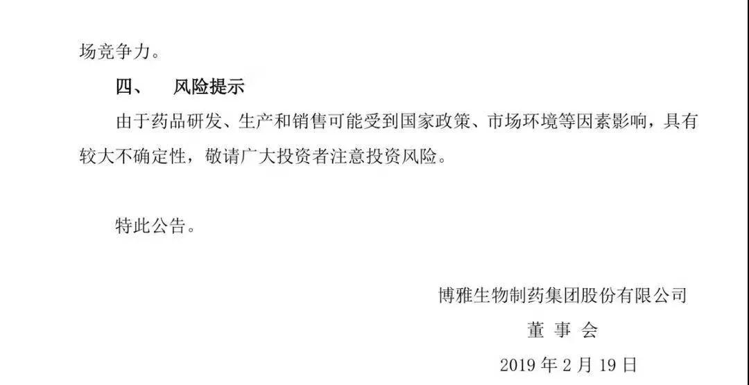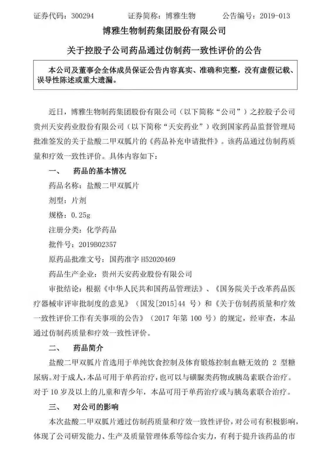 2019年2月19日,,,,,,博雅生物制药集团股份有限公司通告其控股子公司贵州天安药业股份有限公司(以下简称“天安药业”)收到国家药品监视管理局批准签发的关于盐酸二甲双胍片的《药品增补申请批件》。。。。。。。该药品通过仿制药质量和疗效一致性评价。。。。。。。