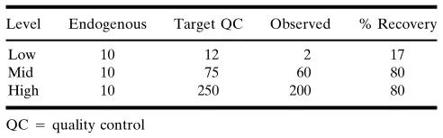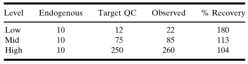 ËùÍøÂçµÄÉúÎïÑùÆ·ÖеĴý²âÎï±£´æÓÚ²î±ðµÄ»ùÖÊÖУ¬£¬£¬£¬£¬£¬£¬°üÀ¨Ñª½¬¡¢ÑªÇå¡¢ÄòÒº¡¢ÄÔ¼¹Òº£¨CSF£©¡¢ÊàŦ»¬ÒººÍ¾ùÖÊ»¯µÄ×éÖ¯¡£¡£¡£¡£¡£¡£¡£¡£ÓÉÓÚ´ý²âÎïµÄÌØÕ÷»áÊܵ½Ñù±¾ÖƱ¸ÒªÁìÓ°Ï죬£¬£¬£¬£¬£¬£¬Òò´Ë±ØÐèÔÚÑù±¾ÊÕÂÞÀú³ÌÖÐÆÀ¹ÀÈçÏÂÒòËØ£ºËùÐèÒªµÄÈκÎÌí¼Ó¼Á£¨¿¹Äý¼Á¡¢ÂѰ×øÒÖÖÆ¼ÁµÈ£©¡¢´ý²âÎïµÄÎȹÌÐÔ£¨Ñª½¬»òѪÇåÊèɢǰµÄȫѪ£©¡¢Ñù±¾ÍøÂçºóµÄ´¦Öóͷ£ºÍÖü´æÌõ¼þ£¨Î¶ȡ¢Æ¿Ð͵ȣ©¡£¡£¡£¡£¡£¡£¡£¡£²âÊÔÃûÌá¢Ñù±¾ÍøÂçÌõ¼þºÍÆäËûÒòËØ¿ÉÄÜ»áÓ°Ïì»ùÖʵÄÑ¡Ôñ£¬£¬£¬£¬£¬£¬£¬ÀýÈçÈôÊÇʹÓÃ×Ô¶¯»¯Ñù±¾´¦Öóͷ£ÏµÍ³£¬£¬£¬£¬£¬£¬£¬ÔòѪÇ彫ÊÇÊ×Ñ¡µÄ»ùÖÊ£¬£¬£¬£¬£¬£¬£¬ÓÉÓÚѪ½¬ÖÐͨ³£º¬ÓÐѪÏËάÂѰ×Äý¿é£¬£¬£¬£¬£¬£¬£¬¿ÉÄÜ»á×ÌÈÅÒÆÒº²Ù×÷¡£¡£¡£¡£¡£¡£¡£¡£Ïà±È֮ϣ¬£¬£¬£¬£¬£¬£¬Ñª½¬ÊDz»Îȹ̴ý²âÎïµÄÊ×Ñ¡»ùÖÊ£¬£¬£¬£¬£¬£¬£¬ÓÉÓÚÖÆ±¸ÑªÇåËùÐèµÄʱ¼ä½Ï³¤£¬£¬£¬£¬£¬£¬£¬²¢ÇÒ±£´æÂѰ×Ë®½âø£¨proteolytic enzyme£©½µ½âÂѰ׵ÄÎÊÌâ¡£¡£¡£¡£¡£¡£¡£¡£±¾ÎÄÉԺ󽫶ÔÑù±¾ÍøÂçºó»ùÖÊÖеĴý²âÎï¾ÙÐиüÈ·ÇеÄÎȹÌÐÔÆÀ¹À¡£¡£¡£¡£¡£¡£¡£¡£¼Ó±êÑùÆ·£¨spiked sample£©µÄ»ùÖÊÓ¦µ±ÓëÔ¤ÆÚµÄδ֪Ñо¿Ñù±¾µÄ»ùÖÊÏàͬ£¬£¬£¬£¬£¬£¬£¬ÒªÊ¹ÓÃÏàͬµÄ»ùÖÊÖÆ±¸±ê׼Ʒ£¨±ê/У׼Ʒ£¬£¬£¬£¬£¬£¬£¬standard/calibrator£©¡£¡£¡£¡£¡£¡£¡£¡£µ±ÔÚ»ùÖÊÖмì²â²»µ½ÄÚÔ´ÐÔÐźÅʱ£¬£¬£¬£¬£¬£¬£¬¼òÆÓµØ¼Ó±ê/½ÓÄÉÑо¿¾Í×ãÒÔÈ·¶¨ºÏÊʵĿÕȱ»ùÖÊ¡£¡£¡£¡£¡£¡£¡£¡£ÔÚÕâЩÌõ¼þÏ£¬£¬£¬£¬£¬£¬£¬½¨ÒéʹÓÃ±ê³ÆÅ¨¶È£¨nominal concentration£©¡£¡£¡£¡£¡£¡£¡£¡£Ïà·´£¬£¬£¬£¬£¬£¬£¬µ±»ùÖÊÖб£´æ¿É¶¨Á¿µÄÄÚÔ´ÐÔÎïÖÊ£¬£¬£¬£¬£¬£¬£¬²¢ÇÒÄÚÔ´ÐÔÎïÖʺÍÍâ¼Ó´ý²âÎïµÄ½ÓÄÉÂÊÊÇÀÛ¼Óʽ£¨ÏßÐÔ£©µÄʱ¼ä£¬£¬£¬£¬£¬£¬£¬¿ÉÒÔÓ¦ÓÃÒ»¸öУÕýÒò×Ó£¨ÀýÈçÄÚÔ´ÐÔŨ¶È4ng/mL£¬£¬£¬£¬£¬£¬£¬¼Ó±êÆÊÎöÎïΪ6ng/mL£¬£¬£¬£¬£¬£¬£¬ÀÛ¼ÓЧӦΪ10ng/mL£©¡£¡£¡£¡£¡£¡£¡£¡£ÔÚÕâÖÖÇéÐÎÏ£¬£¬£¬£¬£¬£¬£¬¿É½«Ëù²â¶¨µÄÄÚÔ´ÐÔŨ¶ÈÓëËùÌí¼ÓµÄ´ý²âÎïŨ¶È£¨±ê³ÆÖµ£©Ïà¼ÓÀ´»ñµÃÖ¸¶¨Öµ£¨assigned value£©£¨±íIIAºÍ±íIIB£©¡£¡£¡£¡£¡£¡£¡£¡£±íIIA.ÄÚÔ´ÐÔÂѰ×ÀÛ¼ÓТ˳ЧӦµÄʾÀý¡£¡£¡£¡£¡£¡£¡£¡£ÔÚÕâÖÖÇéÐÎÏ£¬£¬£¬£¬£¬£¬£¬ÄÚÔ´ÐÔÂѰ׵ÄÓ°Ïì¿ÉÒÔÔÚµÍÖÊÁ¿±ÈÕÕÑùÆ·£¨QC£©ÖÐÊӲ쵽£»£»£»£»£»£»µ«Æä¶ÔÖС¢¸ßˮƽÖÊÁ¿±ÈÕÕÑùÆ·µÄÓ°Ïì²»´ó¡£¡£¡£¡£¡£¡£¡£¡£
