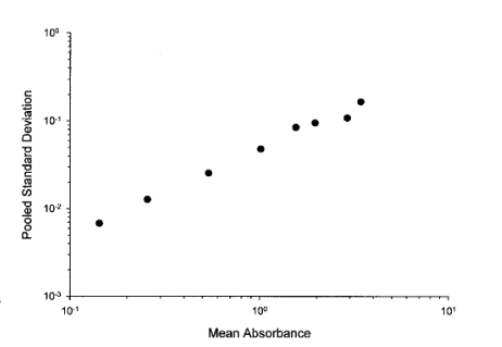 ͼ2. ±íIVËùÁбê×¼ÇúÏßÎü¹â¶ÈÖµµÄ»ìÏýÔËÐУ¨batch£©ÄÚ±ê×¼·½²îÓëÀÛ»ýƽ¾ùÏìÓ¦Ö®¼äµÄ¹ØÏµ¡£¡£¡£¡£¡£¡£¡£¡£Ã¿¸öµã´ú±íÒ»¸öŨ¶ÈµãµÄƽ¾ùÖµºÍͨ¹ý·½²îÆÊÎö£¨ANOVA£©ÅÌËãµÄ±ê×¼·½²î¡£¡£¡£¡£¡£¡£¡£¡£ÔÚ¸ßÎü¹â¶ÈˮƽÏ£¬£¬£¬£¬£¬£¬£¬±äÒìÐԽϴ󣻣»£»£»£»£»ÕâÅú×¢£¬£¬£¬£¬£¬£¬£¬ÔÚÄâºÏ±ê×¼ÇúÏßʱ£¬£¬£¬£¬£¬£¬£¬¼ÓȨ¿ÉÄÜÊÇÊʵ±µÄ¡£¡£¡£¡£¡£¡£¡£¡£