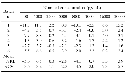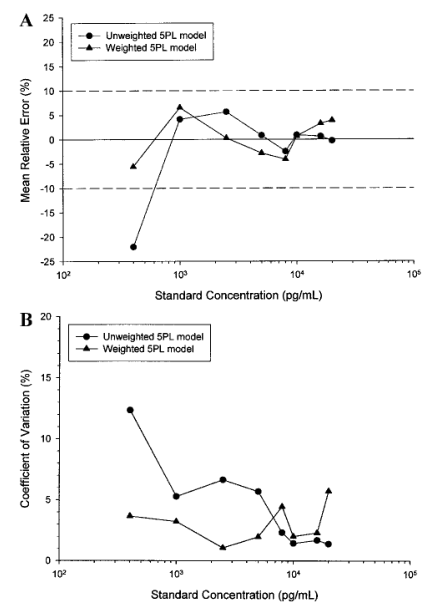 Ò»¸ö¿É±»½ÓÊܵÄУ׼ģ×Ó£¬£¬£¬£¬£¬£¬£¬ÆäÇúÏßµÄÀÛ»ý»ØËãÊýÖµ¹ØÓÚÔÚÔ¤ÆÚµÄ¶¨Á¿¹æÄ£ÄÚµÄËùÓÐŨ¶È£¬£¬£¬£¬£¬£¬£¬Ó¦¾ßÓÐ10%µÄ¾ø¶Ôƽ¾ùREÖµºÍ15%µÄ±äÒìϵÊý£¨CV£©£¨°Ý¼û±íV£©¡£¡£¡£¡£¡£¡£¡£¡£ÔÚУ׼ƷŨ¶È¹æÄ£ÖУ¬£¬£¬£¬£¬£¬£¬ÈôÊÇÆ½¾ùRE±£´æÒ»¸öÇ÷ÊÆ£¬£¬£¬£¬£¬£¬£¬¼´»ØËãŨ¶ÈʼÖÕÒ»ÖµظßÓÚ»òµÍÓÚ±ê³ÆÅ¨¶È£¬£¬£¬£¬£¬£¬£¬ÔòÊÇÄâºÏʧ°ÜµÄÖ¤¾Ý£¬£¬£¬£¬£¬£¬£¬»áʹ¸ÃÄ£×ÓʧЧ¡£¡£¡£¡£¡£¡£¡£¡£ÄâºÏʧ°Ü¿ÉÄÜÊÇÓÉÓÚÑ¡ÔñÁ˲»¶ÔÊÊµÄÆ½¾ùÖµº¯Êý£¨ÀýÈ磬£¬£¬£¬£¬£¬£¬ÔÚŨ¶È-ÏìÓ¦ÇúÏß²î³Ø³ÆÊ±Ê¹ÓÃÁË4PLº¯Êý£©»ò¼ÓȨÀú³Ì²»µ±¡£¡£¡£¡£¡£¡£¡£¡£ÀýÈ磬£¬£¬£¬£¬£¬£¬¼ÓȨʹµÃÄâºÏµÄÇúÏßÓë±íIVÖеÄÊý¾Ý¸üÏà·û£¬£¬£¬£¬£¬£¬£¬ÆäÖ¤¾ÝÊÇ£ºÔڽϵÍŨ¶È²¿·Ö£¬£¬£¬£¬£¬£¬£¬½µµÍÁËÆ½¾ùRE(ͼ3A)ºÍCV(ͼ3B)£»£»£»£»£»£»¶øÔڽϸßŨ¶È²¿·Ö£¬£¬£¬£¬£¬£¬£¬×¼È·ÐÔ»òϸÃܶȵÄËðʧ¼«Ð¡¡£¡£¡£¡£¡£¡£¡£¡£Í¼3. A.δ¼ÓȨºÍ¼ÓȨÎå²ÎÊýlogistic(5PL)»Ø¹éÇúÏß»ØËãŨ¶ÈµÄÀÛ»ýƽ¾ùÏà¶ÔÎó²î°Ù·Ö±ÈµÄ½ÏÁ¿Óë±íIVµÄÎü¹â¶ÈÊý¾ÝÏàÎǺϡ£¡£¡£¡£¡£¡£¡£¡£¼ÓȨģ×ÓµÄЧ¹ûÔÚÕû¸ö±ê׼Ũ¶È¹æÄ£ÊÇ¿ÉÒÔ½ÓÊܵ쬣¬£¬£¬£¬£¬£¬¶ø·Ç¼ÓȨģ×ÓÔÚµÍÓÚ1000pg/mLŨ¶ÈÊDz»¿É½ÓÊܵġ£¡£¡£¡£¡£¡£¡£¡£B.δ¼ÓȨºÍ¼ÓȨÎå²ÎÊýlogistic (5PL)»Ø¹éÇúÏß»ØËãŨ¶Èת±äµÄÀÛ»ý°Ù·Ö±ÈϵÊýµÄ½ÏÁ¿Óë±íIVµÄÎü¹â¶ÈÊý¾ÝÏàÎǺϡ£¡£¡£¡£¡£¡£¡£¡£¼ÓȨ»Ø¹éÄ£×ÓµÄÅÌËãÖµ×ܽáÈçÏÂÔÚ±íVÖС£¡£¡£¡£¡£¡£¡£¡£¼ÓȨģ×ÓÔڽϵÍŨ¶ÈˮƽÏ»ñµÃÁ˽ÏСµÄÅú¼äת±äϵÊý¡£¡£¡£¡£¡£¡£¡£¡£