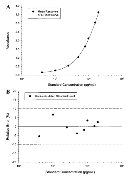 ÓÉÓÚ±ê×¼µãŨ¶ÈÔÚÒªÁìÑéÖ¤×îÏȺó²»Ó¦¸Ä±ä£¬£¬£¬£¬£¬£¬£¬Òò´ËÔÚÒªÁ쿪·¢Àú³ÌÖÐÓ¦°üÀ¨¸ü¶àµÄ±ê×¼µã£¨standard point£©ºÍÖØ¸´µã£¨replicates£©£¬£¬£¬£¬£¬£¬£¬ÒԱ㾡ÔçµØÏêϸÑо¿Å¨¶È-ÏìÓ¦¹ØÏµ£¬£¬£¬£¬£¬£¬£¬¾¡¿ÉÄܵØÊµÏÖΪ»Ø¹éÄ£×ÓÌṩ¿É¿¿µÄÆÀ¹À¡£¡£¡£¡£¡£¡£¡£¡£±ê×¼²ÎÕÕ£¨±È£©ÎïŨ¶ÈµãµÄ¹æÄ£Ó¦°üÀ¨Ï¡ÊͺóÑо¿ÑùÆ·µÄŨ¶È£¬£¬£¬£¬£¬£¬£¬²¢ÔÚ¶ÔÊý¿Ì¶ÈÉϽüËÆÔȳƵؾàÀë¡£¡£¡£¡£¡£¡£¡£¡£½¨ÒéÖÁÉÙÓÐ10¸ö·ÇÁã±ê׼Ũ¶Èµã£¨¸´¿×£¬£¬£¬£¬£¬£¬£¬duplicate£©ÓÃÓÚŨ¶È-ÏìÓ¦¹ØÏµ£¬£¬£¬£¬£¬£¬£¬ÓÃÓÚÆäÔçÆÚÌØÕ÷µÄÐÎò¡£¡£¡£¡£¡£¡£¡£¡£¸ÃŨ¶È-ÏìÓ¦¹ØÏµ¿ÉÒÔʹÓÃ4/5²ÎÊýµÄlogisticº¯Êý£¨4/5PL Ä£×Ó£©À´ÐÎò¡£¡£¡£¡£¡£¡£¡£¡£±ê×¼ÇúÏßÓ¦ÄâºÏУ׼Ũ¶ÈµãµÄƽ¾ùÏìÓ¦Öµ£¨Í¼1A£©¡£¡£¡£¡£¡£¡£¡£¡£Í¼1. A.5²ÎÊýlogistic (5PL)¼ÓȨ·ÇÏßÐÔ×îС¶þ³Ë·¨»Ø¹éÄâºÏµÄÇúÏß¡£¡£¡£¡£¡£¡£¡£¡£Æ½¾ùÏìÓ¦ÊDZíIV.ÖÐÁгöÁ˵Ú6¸öÔËÐУ¨batch£©µÄÖØ¸´Ð§¹û¡£¡£¡£¡£¡£¡£¡£¡£B.ͼ1AÖлØËã±ê×¼µãŨ¶ÈµÄ°Ù·Ö±ÈÏà¶ÔÎó²î¡£¡£¡£¡£¡£¡£¡£¡£ËùÓÐÊýÖµ¶¼ÔÚ±ê³ÆÖµµÄ10%ÒÔÄÚ¡£¡£¡£¡£¡£¡£¡£¡£