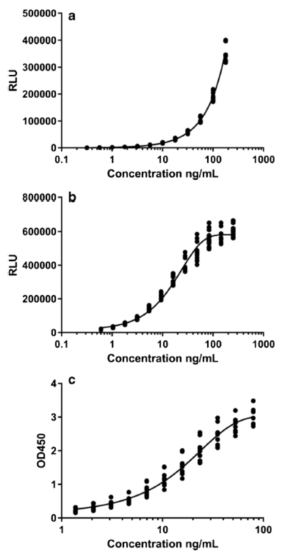 ͼ2. 3¸ö°¸ÀýÑо¿ÖеÄУ׼ÇúÏߣº°¸Àý A£¨a£©£¬£¬£¬£¬£¬£¬£¬£¬°¸Àý B£¨b£© ºÍ°¸Àý C£¨c£©¡£¡£¡£¡£¡£¡£¡£¸ÃͼչʾÁË3Ìõ±ê×¼ÇúÏßµÄÐÎ×´£¬£¬£¬£¬£¬£¬£¬£¬´ú±íÁËÔÚLBA²âÊÔÖÐͨ³£ÊӲ쵽µÄµä·¶·ÇÏßÐÔÏìÓ¦¡£¡£¡£¡£¡£¡£¡£XÖá´ú±íУ׼µãŨ¶ÈµÄ¶ÔÊý£¬£¬£¬£¬£¬£¬£¬£¬YÖá´ú±íÏìÓ¦¶ÁÊý£º°¸ÀýAºÍBÊÇÏà¶Ô¹âµ¥Î»£¨RLU£©£¬£¬£¬£¬£¬£¬£¬£¬°¸ÀýCÊÇ450 nM ¹âѧÃܶȣ¨OD 450£©¡£¡£¡£¡£¡£¡£¡£