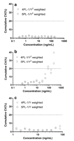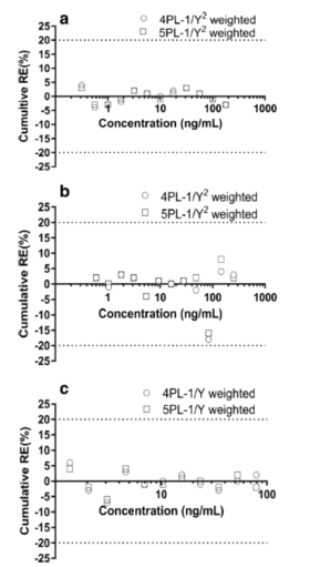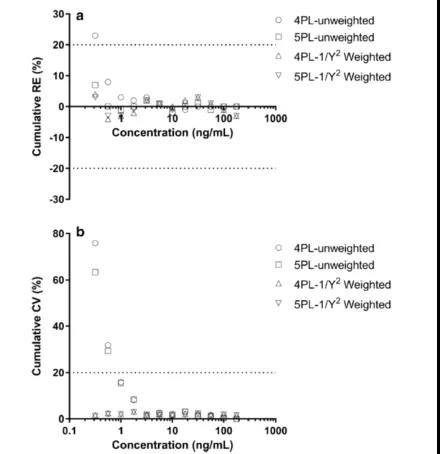 ΪÁËÑéÖ¤ËùÑ¡Ôñ»Ø¹éÄ£×ÓºÍÈ¨ÖØº¯Êý£¬£¬£¬£¬£¬£¬£¬£¬¿ÉÒÔ×öÆäËûÆÀ¹À¡£¡£¡£¡£¡£¡£¡£ÀýÈ磬£¬£¬£¬£¬£¬£¬£¬ÔÚʹÓÃÈ¨ÖØº¯Êý֮ǰºÍÖ®ºó£¬£¬£¬£¬£¬£¬£¬£¬¿ÉÒÔ½ÏÁ¿4PLºÍ5PLÄ£×ÓµÄ׼ȷ¶ÈºÍϸÃܶÈÐÐΪ¡£¡£¡£¡£¡£¡£¡£±¾Îĸø³öÁË4PLÓë5PL£¨ÎÞ¼ÓȨºÍ 1/Y2¼ÓȨ£©µÄÀÛ»ý %CV ºÍÀÛ»ý %RE µÄ½ÏÁ¿£¬£¬£¬£¬£¬£¬£¬£¬ÀÛ»ý %REµÄ¿É½ÓÊܹæÄ£Îª¡À 20%£¬£¬£¬£¬£¬£¬£¬£¬ÀÛ»ý %CV µÄ¿É½ÓÊܹæÄ£Îª¡Ü20%¡£¡£¡£¡£¡£¡£¡£