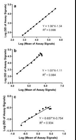 ͼ3. °¸ÀýA£¨a£©¡¢°¸ÀýB£¨b£©ºÍ°¸ÀýC£¨c£©µÄÒì·½²îÐԸſö¡£¡£¡£¡£¡£¡£¡£XÖá´ú±íУ׼µãŨ¶ÈµÄ¶ÔÊý£¬£¬£¬£¬£¬£¬£¬£¬YÖá´ú±íʵÑéÔËÐÐÖвâÊÔÐźŵÄSD¡£¡£¡£¡£¡£¡£¡£