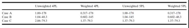 ±í2ÏÔʾ£¬£¬£¬£¬£¬£¬£¬£¬Ê¹ÓÃÊʵ±µÄÈ¨ÖØº¯Êý¿ÉÒÔÀ©Õ¹ROQ¡£¡£¡£¡£¡£¡£¡£¶Ô°¸ÀýB£¬£¬£¬£¬£¬£¬£¬£¬Ó¦ÓÃÈ¨ÖØº¯Êýµ½4PL»Ø¹éÄ£×Ӻ󣬣¬£¬£¬£¬£¬£¬£¬ROQ»ñµÃÏÔÖøÀ©Õ¹£»£»£»£»£»£»£»£»´Óδ¼ÓȨµÄ1.04-48.3 ng/mLµ½ ¼ÓȨµÄ0.602-145 ng/mL£»£»£»£»£»£»£»£»¼ÓȨ5PLÄ£×ÓµÄROQ£¬£¬£¬£¬£¬£¬£¬£¬Ôò´Óδ¼ÓȨ1.04-145 ng/mL±äΪ¼ÓȨµÄ0.602-48.3 ng/mL¡£¡£¡£¡£¡£¡£¡£¶Ô°¸ÀýC£¬£¬£¬£¬£¬£¬£¬£¬4PLÄ£×ÓµÄROQÂÔÓÐÀ©Õ¹£º´Óδ¼ÓȨµÄ2.06-79.3 ng/mL£¬£¬£¬£¬£¬£¬£¬£¬µ½¼ÓȨµÄ1.37-79.3 ng/mL¡£¡£¡£¡£¡£¡£¡£¹ØÓÚ5PLÄ£×Ó£¬£¬£¬£¬£¬£¬£¬£¬Ê¹ÓÃÈ¨ÖØº¯ÊýºóROQûÓÐÔöÌí¡£¡£¡£¡£¡£¡£¡£