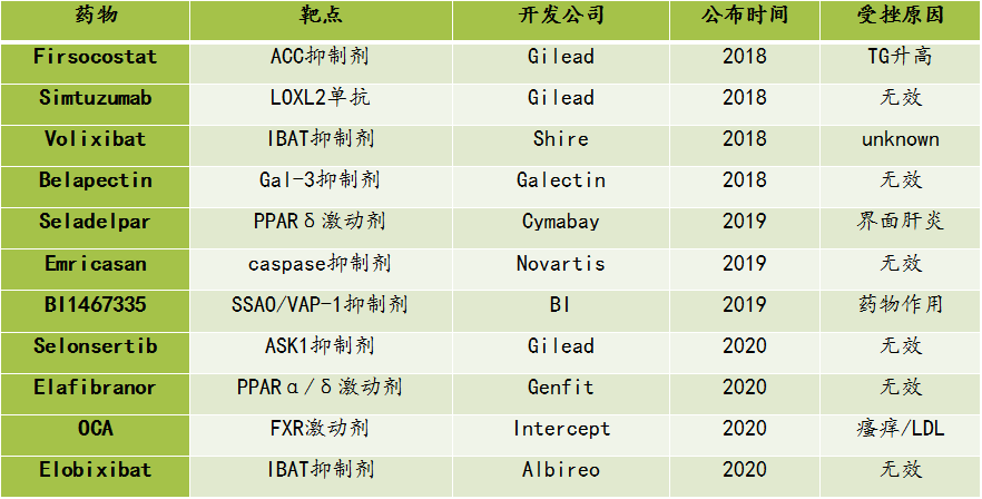 王建华列举了现在治疗NAFLD/NASH领域主要的II/III期临床试验失败靶点和新药(表1) ,,,,,希望能够给肝病新药研发职员一定的履历和启发。。。。。。。。