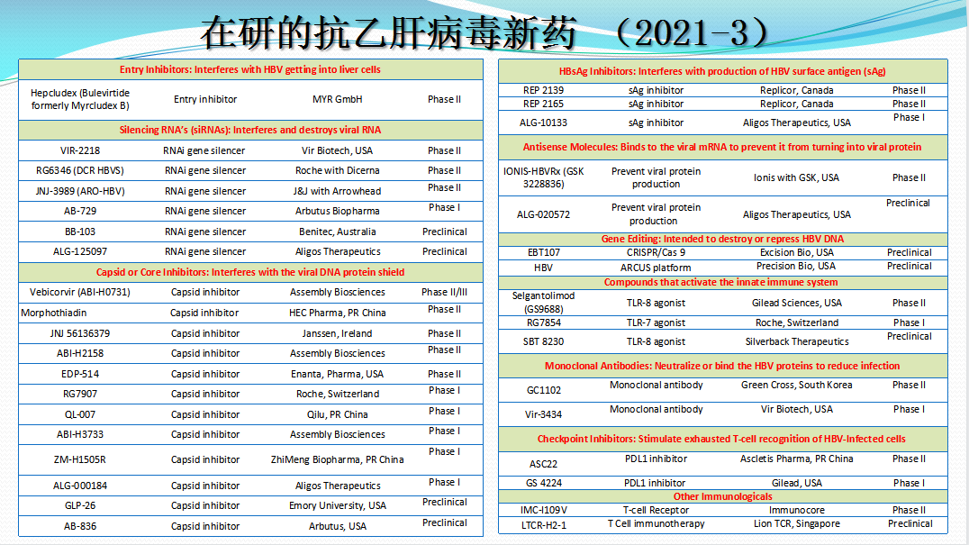 “目今 ,,,,,全球在研乙肝药物靶点(新药)主要是核衣壳抑制剂siRNAHBsAg释放抑制剂、cccDNA形成抑制剂以及先天免疫激活剂等。。。。。。。。”王建华说 ,,,,,现在海内乙肝新药研发管线中核衣壳抑制剂为数较多 ,,,,,但从效果上看siRNA或将更具远景。。。。。。。。