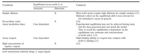 ³ýÁË˼Á¿¸øÒ©ºómAb-LÍŽáµÄÌåÄÚ¶¯Á¦Ñ§Í⣬£¬£¬£¬£¬£¬ÀëÌå״̬£¨ex vivo conditions£©ÈçÑùÆ·ÊÕÂÞ¡¢Öü´æ¡¢ÔËÊäºÍÑùÌìÖ°ÎöµÈ¿ÉÄÜʹÑù±¾µÄƽºâ״̬ÓëÌåÄÚ£¨in vivo£©×´Ì¬´ó²»Ïàͬ¡£¡£¡£¡£¡£¡£¡£¡£±í5ÁгöÁËһЩ¿ÉÄÜÓ°ÏìÍŽá»ò½âÀëÆ½ºâ¶¯Á¦Ñ§µÄ״̬¡£¡£¡£¡£¡£¡£¡£¡£