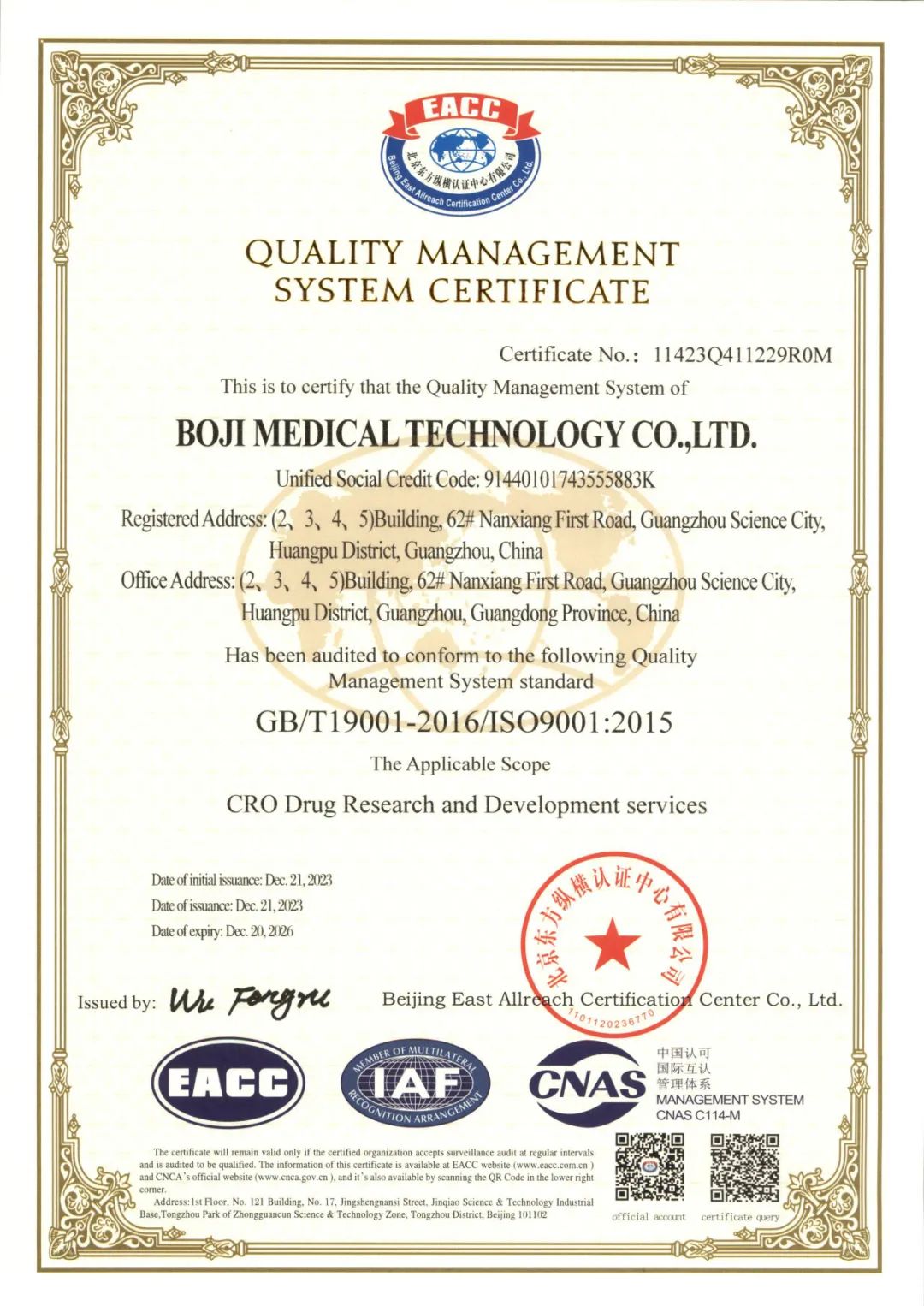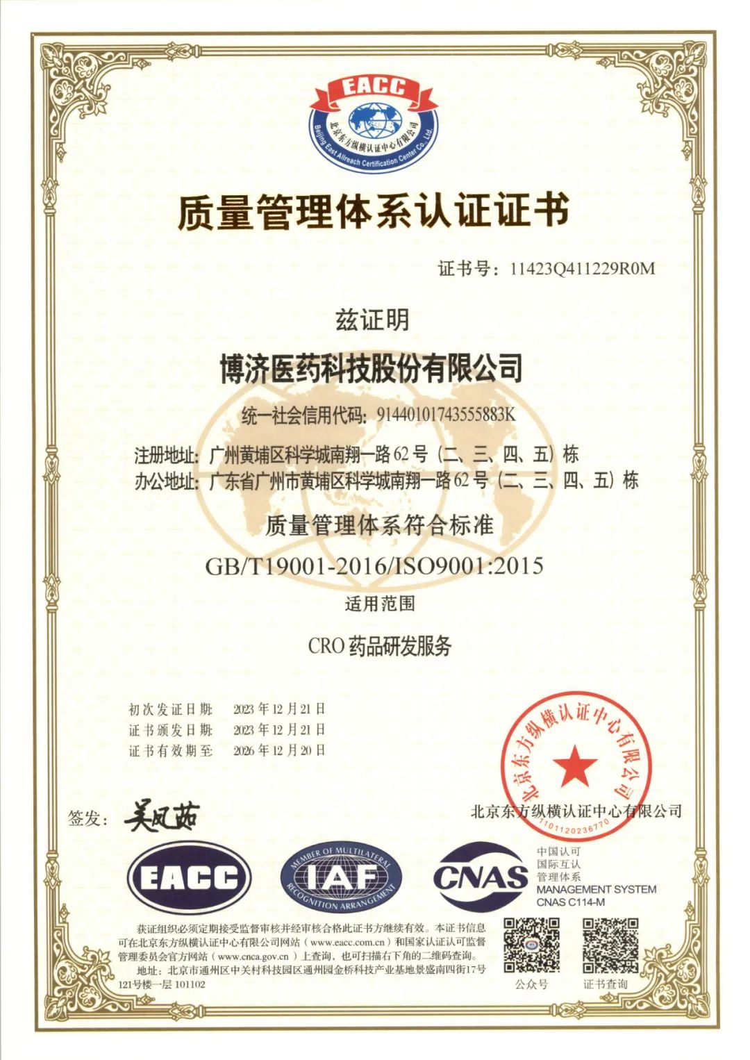 克日,,,,,,,7790必发集团医药通过ISO9001质量管理认证机构专家周全、严酷、详尽的审核,,,,,,,乐成获得GB/T19001-2016/ISO 9001:2015标准质量管理系统认证证书,,,,,,,确认我司的手艺水平、条件、管理切合 ISO9001质量管理系统标准的要求,,,,,,,认证规模为“CRO药品研发服务”。。。。。